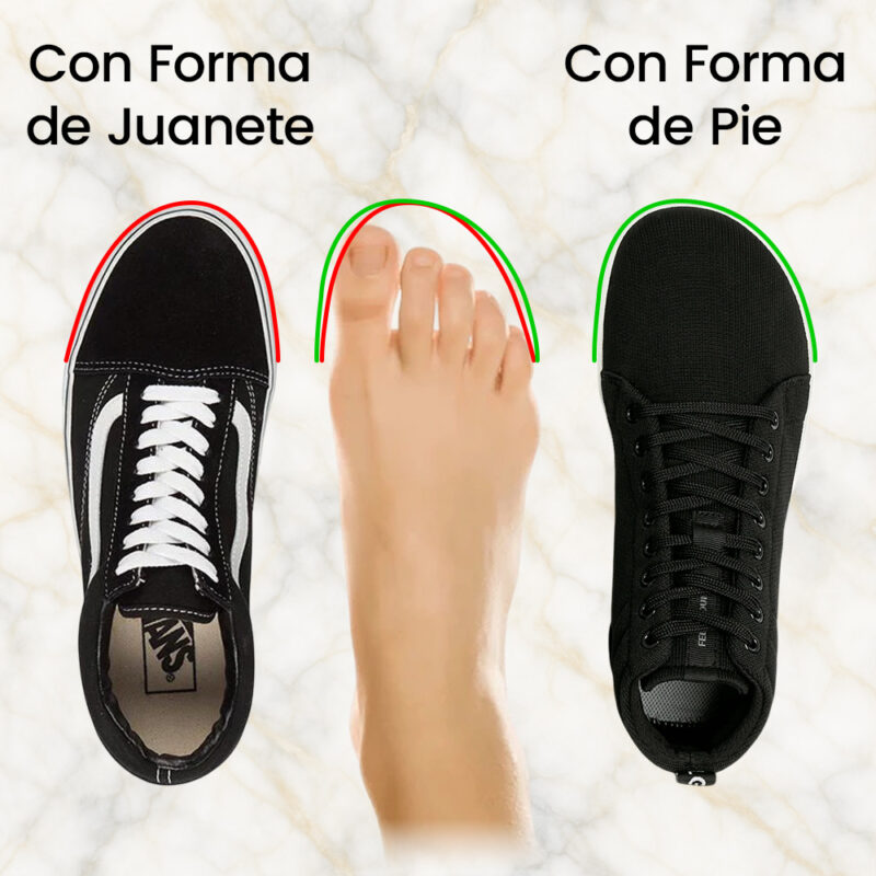 • Forma del Pie: Las Vans tienen una forma más parecida a una tabla que a un pie humano. Cada vez más estudios demuestran que las punteras estrechas pueden provocar juanetes y otros problemas comunes en los pies.